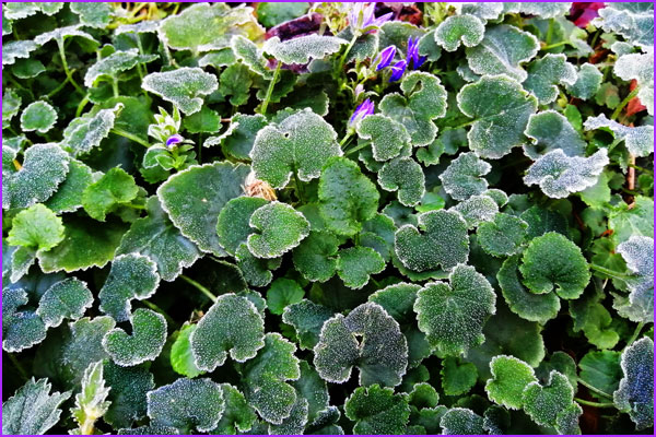 Last night was our coldest this winter: -2.1°C and this morning brave flowers are pushing through the icy leaves.