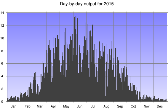 Summary The year-on-year improvement continues, generating nearly 90kWh more than 2014. Various records were set: for the first time we passed 1,500kWh and 4kWh/day, and earned over £700 and £2/day. There was a very sunny April which topped 200kWh for the first time and where the daily average exceeded that of both May and July. Records were also set for June and September, and the poor months were those with low totals anyway. There were 3 zero-watt days, one in January caused by snow and two in December due to wet and very murky weather; December was also our first month generating less than 10kWh. |