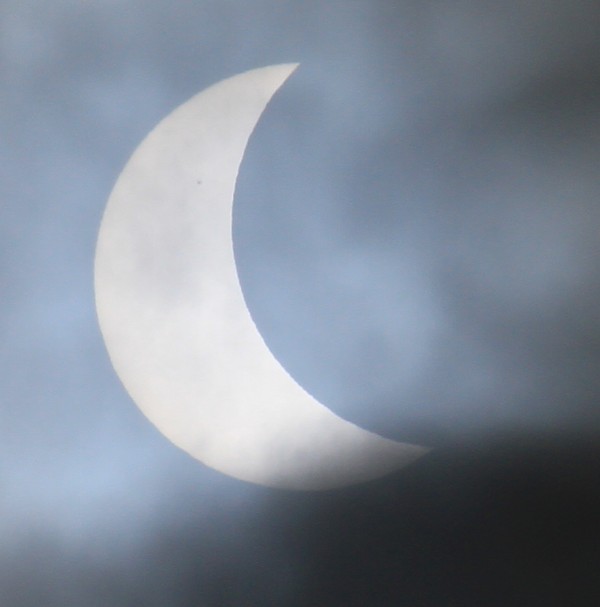 The day of the eclipse. We decided not to go to the Faroe Islands, fortunately so as it was clouded over apart from the last few seconds of totality. Good views from Svalbard though, and here in Leeds we had enough gaps in the clouds to get some decent pictures. Here’s an early stage, with a sunspot visible in the upper half: