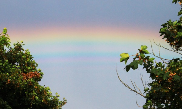 Sun, clouds, showers and a rainbow with prominent supernumeraries.