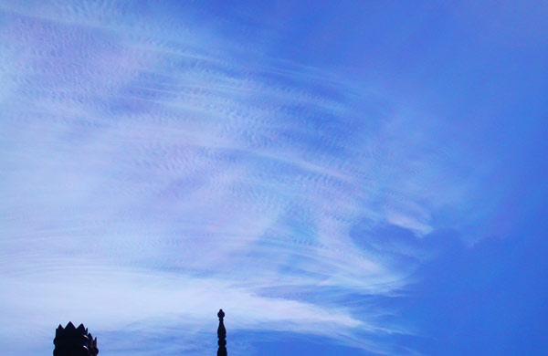 Cloud of the Day: Cirrocumulus With a hint of iridescence. Admin2 is reading The Dervish House by Ian McDonald.