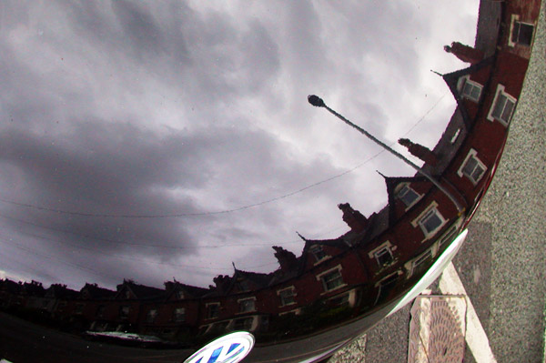 Cloud of the Day: Altostratus Grey skies reflected in a shiny car. Admin2 is reading Crashing Heaven by Al Robertson which was smashing.