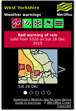By all accounts there was serious flooding downhill from us, but since all transport systems were out of order we couldn’t get out to see it, or to splash any cash in the Boxing Day sales. Leeds also had a red rain warning, very unusually.