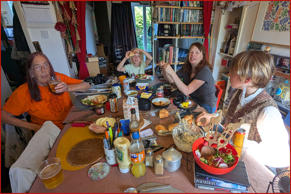A1 cooked succulent burgers, chips and salad for our family dinner and A2 made courgette, halloumi and chickpea fritters for the veggies. We had a chocolate, cherry and cream cake from yesterday’s paper for afters…