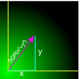 The above methods will work for a quick-and-dirty radial fill, but to do it properly the area (which is a square with sides 2xradius) has to be scanned on a pixel-by-pixel basis. For each pixel in the area simple geometry will give us the colour of the pixel at that point — see right. We set the graphics origin to the centre of the fill, to make things a bit easier. A radial fill is completely symmetric, so we only need to do this calculation for one quadrant; the other three can be filled in by negating the x and y coordinates.
