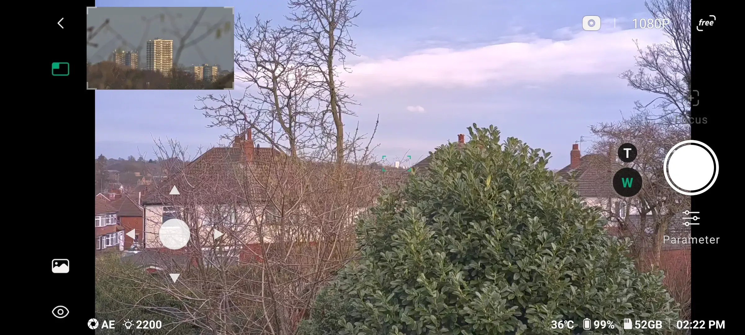 This is just a view out of our office window, to show the features. At top left, the inset image is the view through the telephoto lens, which shows the area outlined in green in the centre of the main display — here looking at a distant tower block. You can turn off this inset image by touching the green rectangle next to it.