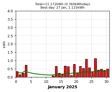 Summary Despite the year being bookended with gloom -- January, February, October and December were our worst ever -- it was the second-best year for output and the best for income, due to an excellent spring and early summer. A great improvement over 2024. 2025 saw some milestones. 11 July was the earliest date we've reached 1,000KwH for the year; it was also the warmest day of the year, at 32.6°C. 8 August was our 5,000th day of generating solar power, and also on that day, quite coincidentally, the total power generation reached 20MWh. And on the 300th day of the year, 28 October, we reached 1,500.000kWh precisely in our output for the year, giving an average of exactly 5.000kWh per day. The solar panel page had an update, with a new display giving the monthly anomalies for each year -- see right. There were 8 zero-watt days, all in January in an extended snowy spell, and one day over 13kWh. |